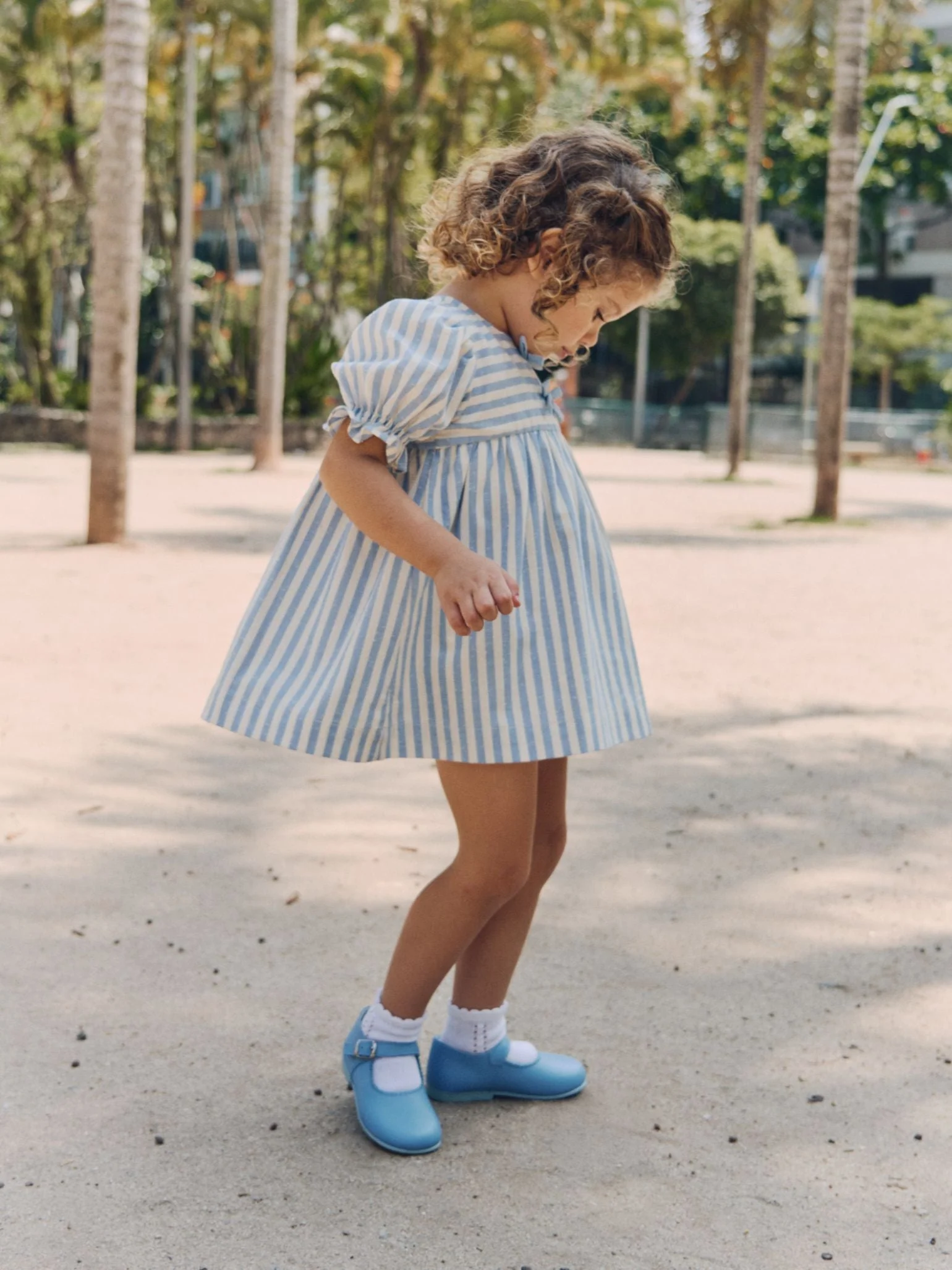 La Coqueta’s Luciana Baby Girl Set perfectly embodies Celia Muñoz’s dedication to heirloom-quality design and Spanish craftsmanship. Inspired by the traditional styles of Celia’s childhood in Granada, this two-piece set marries practicality with delicate, feminine charm. Crafted from luxurious pure cotton, it is exceptionally soft, breathable, and gentle on even the most sensitive skin, making it ideal for all-day comfort. The top features a sweet fit-and-flare silhouette, with a raised waist and short sleeves gathered at the cuffs to create a subtle, voluminous effect. Delicate attached bows adorn the yoke, adding a playful, charming touch, while the rounded, collarless neckline maintains a simple, elegant aesthetic. The matching bloomers are elasticated at the waist and cuffs for both comfort and ease of movement, perfectly complementing the top. The dreamy dusty blue and white stripe pattern gives the set a refined, classic feel, ensuring timeless appeal. A mother of pearl button placket at the back allows for effortless dressing and showcases La Coqueta’s commitment to meticulous craftsmanship and thoughtful detailing. This versatile set is ideal for everyday wear, family gatherings, or special occasions, combining comfort, elegance, and practicality in one beautiful ensemble. Coordinate with a big sister wearing the Luciana Girl Dress for those adorable, picture-perfect moments.