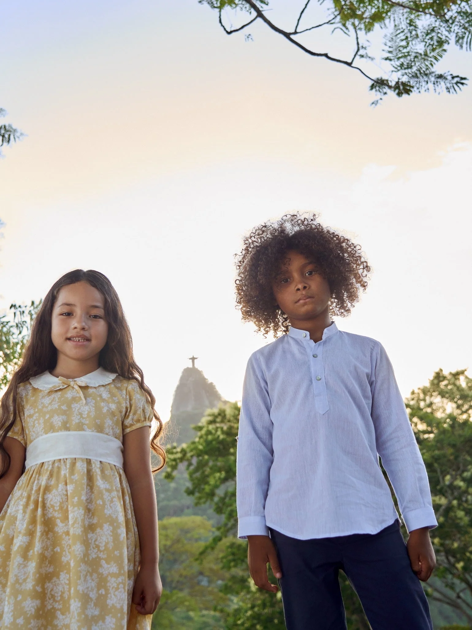 La Coqueta’s Jazmin Linen Mix Long Sleeve Boy Shirt is the ideal choice for sunny outdoor days. Crafted in Spain from a high-quality blend of linen and cotton, it is rendered in a dreamy shade of light blue. It features a stylish mandarin stand collar, a classic long-sleeve popover silhouette with mother of pearl buttons, and a classic centre box pleat for a relaxed fit that allows for a range of motion, perfect for little boys on the go. It has a curved hem and a single rounded one-button cuff, with attached buttons at the elbow to roll up for the sleeves for an alternative, more casual fit. Whether paired with Bermuda shorts for a casual look or chinos for a smarter appearance, this versatile shirt ensures your little boy will stay stylish and comfortable throughout the season.