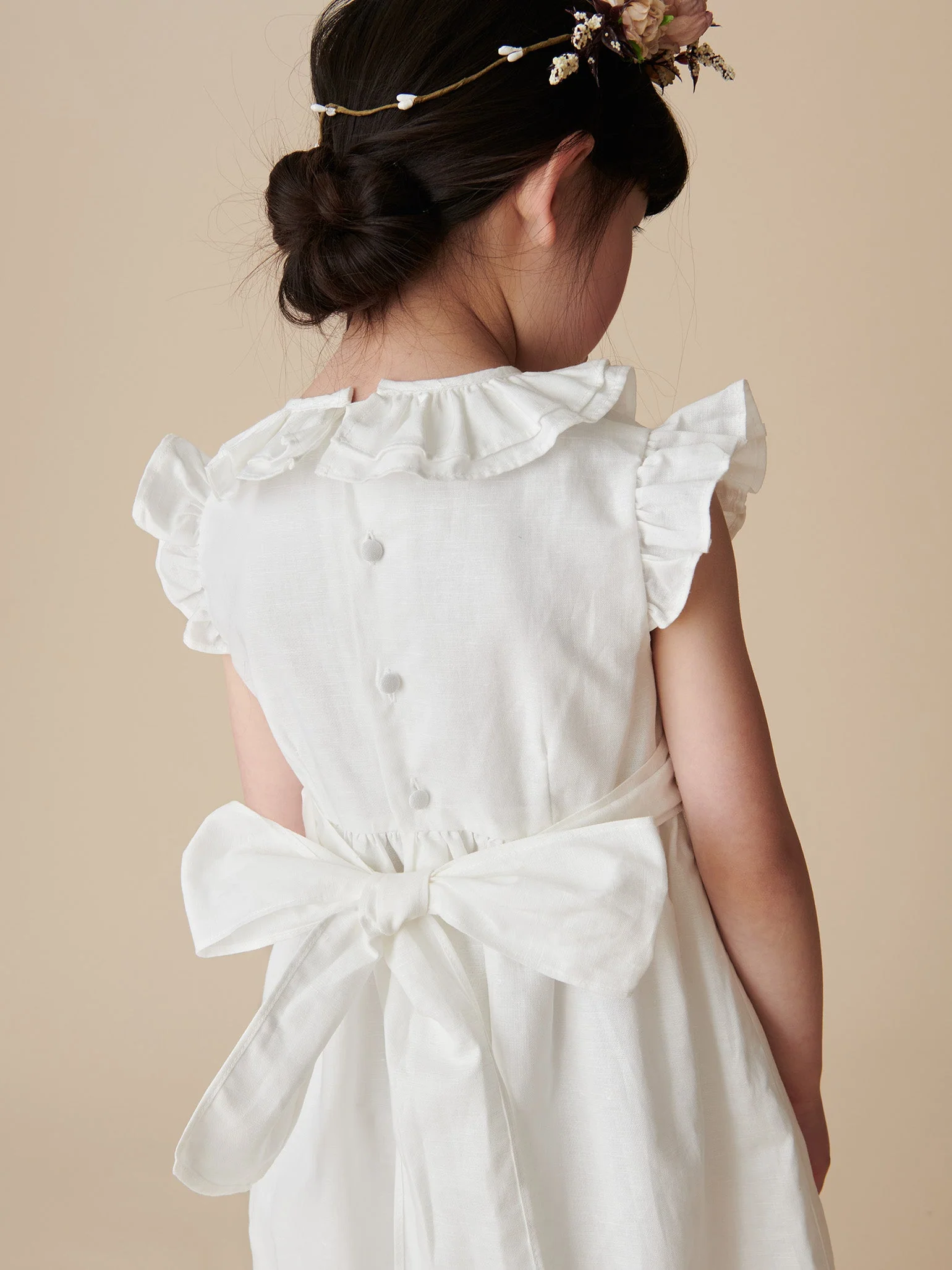 Step into a world of refined elegance with La Coqueta’s latest rendition of Special Occasion styles, designed for the most precious of events in your diary this season. The Maya Ceremony Girl Dress exudes sophistication, crafted from the finest raw silk with intricate frill detailing and a flattering full skirt that moves beautifully with each step. A timeless ivory silhouette with a frill collar neckline and delicate covered button fastenings, this dress is perfect for christenings, weddings, and celebrations, offering an effortlessly graceful look that will captivate from morning to evening. It has a wide panel silk ribbon that ties around the waist for an oversized self-tie bow, and charming butterfly frill sleeves that are so delicately feminine. Perfect for bridesmaids and flower girls, it’s a piece to cherish forever.