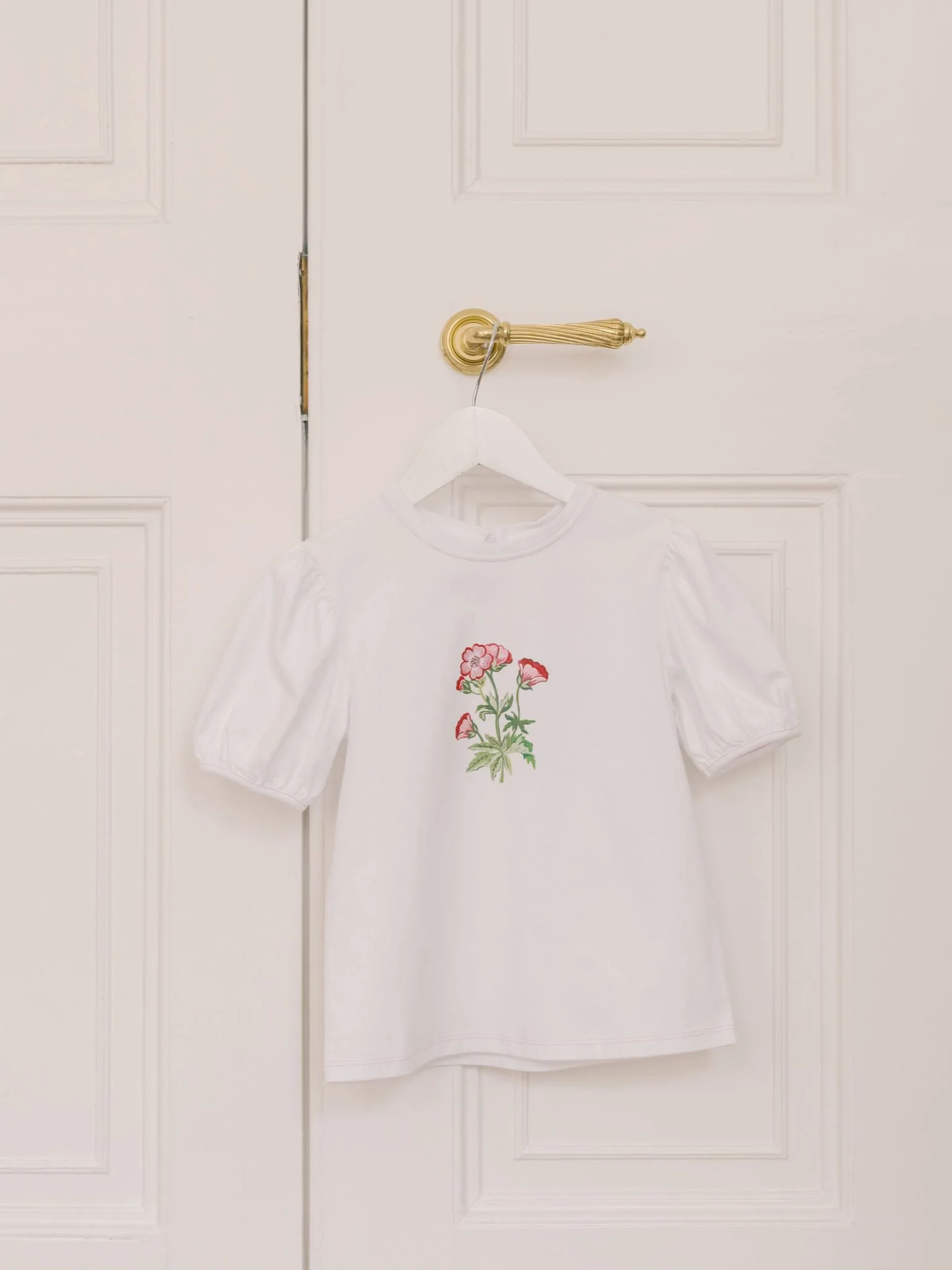 La Coqueta’s Scarlet Girl Top captures the carefree spirit of summer with its beautifully feminine details and vintage-inspired silhouette. Crafted from pure cotton jersey with a soft, smooth handle, it is gentle on delicate skin and perfectly suited to warm-weather wear. Lightweight and breathable, it offers all-day comfort while remaining effortlessly refined. Designed with charming puffed sleeves gathered into neat elasticated cuffs, the top has a timeless, romantic feel, complemented by a classic white round neckline that adds a touch of understated elegance. A single button fastening at the back of the neck allows for easy, fuss-free dressing, making it a practical choice for busy mornings. The relaxed-fit silhouette ensures complete freedom of movement, ideal for active play and everyday adventures, while still looking polished and special. Delicately embroidered at the chest with a floral motif in soft pink and green tones, each detail is carefully crafted by skilled artisans, reflecting La Coqueta’s commitment to heritage craftsmanship. Proudly made in La Coqueta’s family-owned ateliers, the Scarlet Girl Top is a versatile and timeless piece that can be styled with skirts, shorts, or trousers. Perfect for family gatherings, playdates, or simply those moments when your little one wants to feel extra special, it’s a wardrobe staple designed to be worn, loved, and remembered.